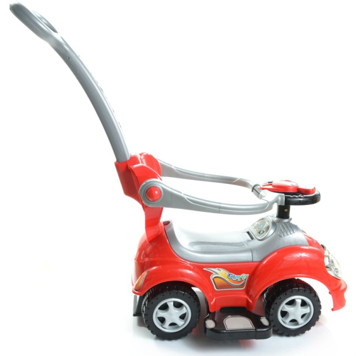 Jeździk posiada długą rączkę do pchania pojazdu, którą można ściągnąć w razie potrzeby. Wyposażony został wyprofilowane siedzisko i wygodne oparcie, gwarantujące komfortową zabawę, a także szerokie bieżnikowane koła, pozwalające na swobodną jazdę zarówno w domu, jak i na zewnątrz.
